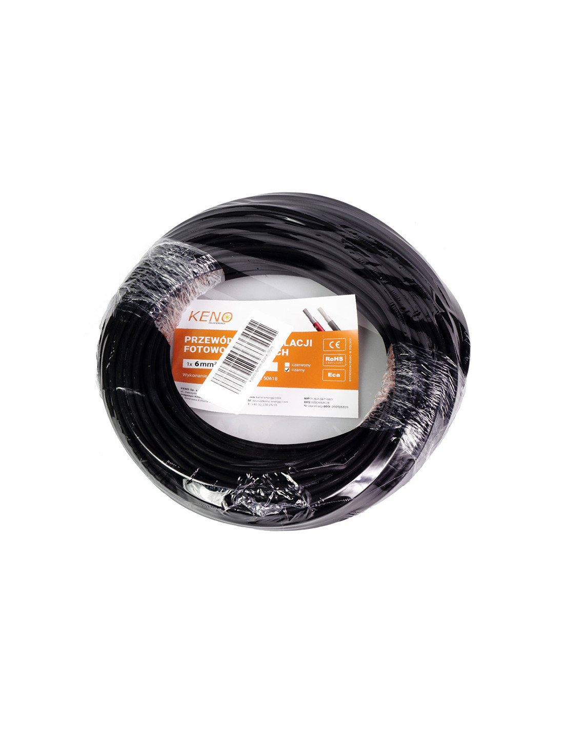 KENO 6mm² juodas laidas 50m pakuotėje. Naudojamas fotovoltiniuose įrenginiuose jungtims tarp atskirų fotovoltinių plokščių ir tarp plokščių bei keitiklio. Be to, kabeliai yra atsparūs ozonui ir UV spinduliams, todėl tinkami naudoti sausose ir drėgnose patalpose, po žeme ir lauke, esant tiesioginiams saulės spinduliams.